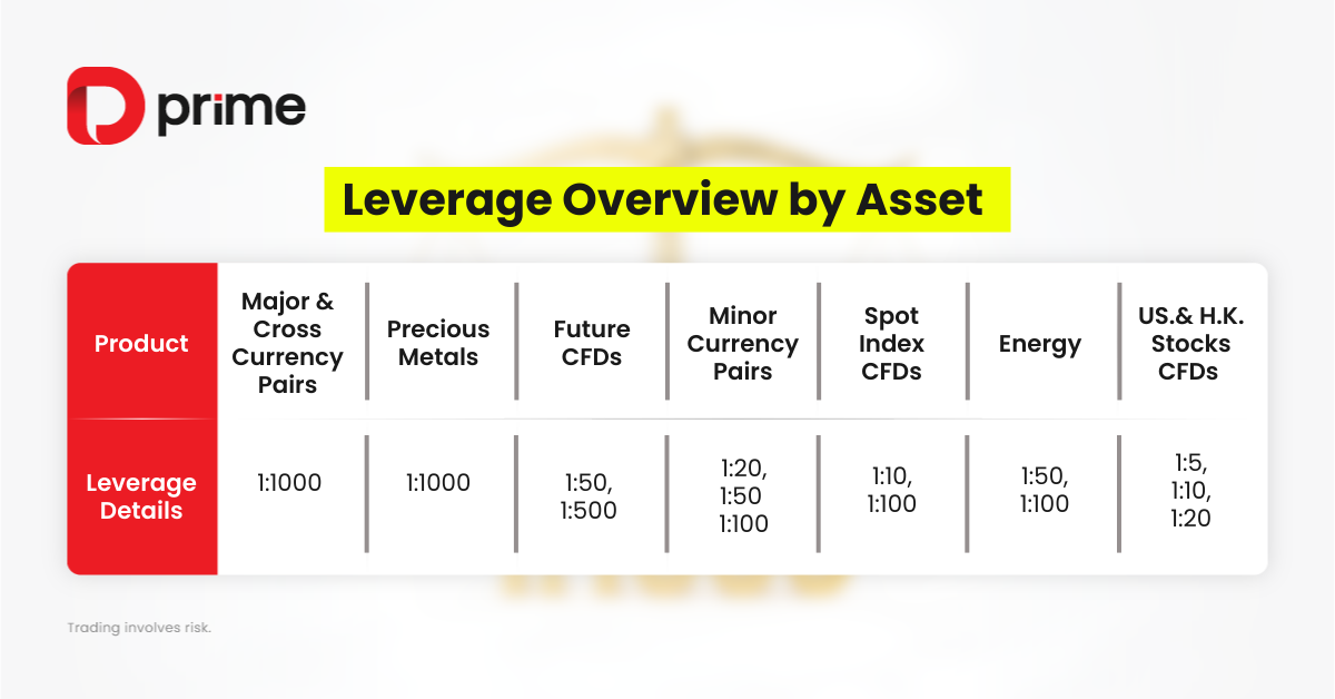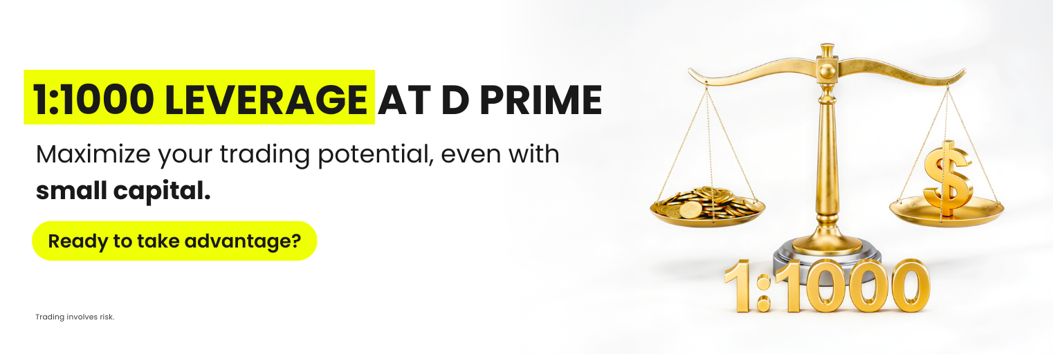 At D Prime, we offer leverage ratios of up to 1:1000 across our product ecosystem. This allows traders to choose the leverage level that best fits their strategy while managing their margin efficiently.