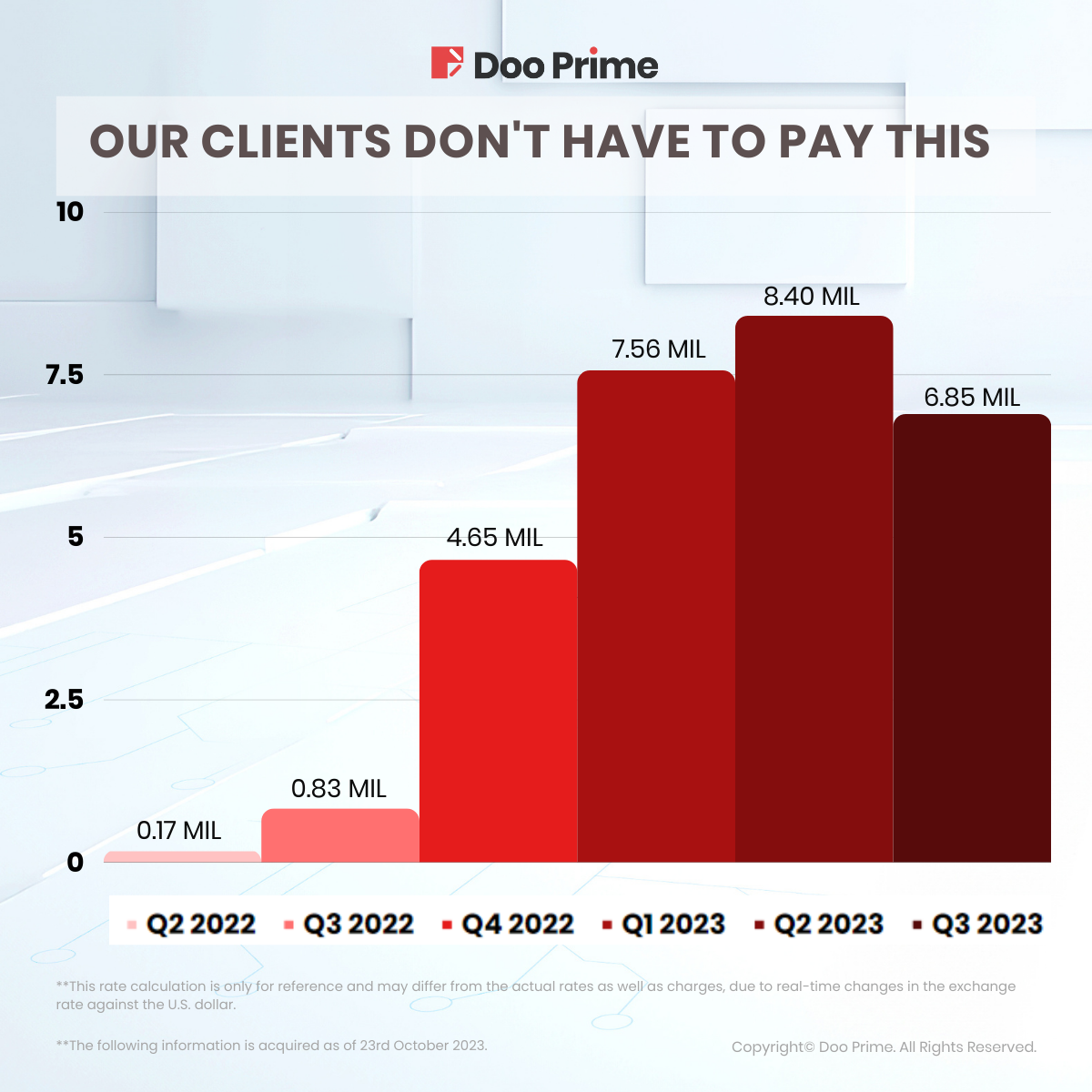 Doo Prime’s Swap-Free and Swap Reduction Campaign started off strong in Q2 of 2022 and eliminated a total swap fee of USD 0.17 million. The numbers have been steadily rising over time, indicating that more traders are taking advantage of the campaign from Q2 2022 to Q3 2023.