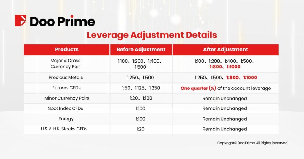 Doo Prime officially increased the leverage option from 1:500 to 1:1000 for all account types on 19th November 2022. The adjustment offers more flexible options, providing global clients the opportunity to leverage higher potential profits with less capital and further expand their investment opportunities.