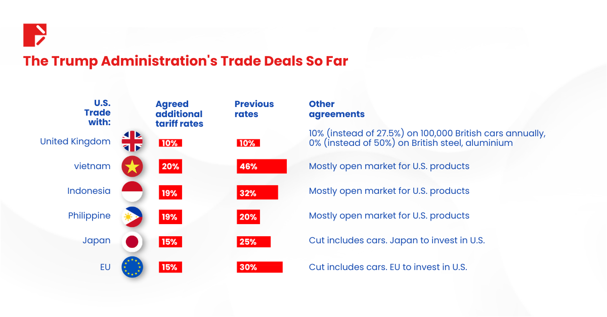 As the chart below shows, since the April 2025 tariff hike announcement, the US has inked or outlined new trade terms with the U.K., Vietnam, Indonesia, the Philippines, and Japan, each deal cutting previous tariff rates and opening access for U.S. goods.