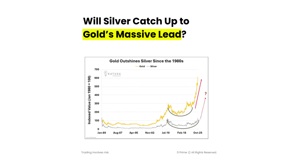 That dotted purple arrow is the speculative path analysts are watching, a potential mean reversion trade where silver begins to close the decades-long performance gap.