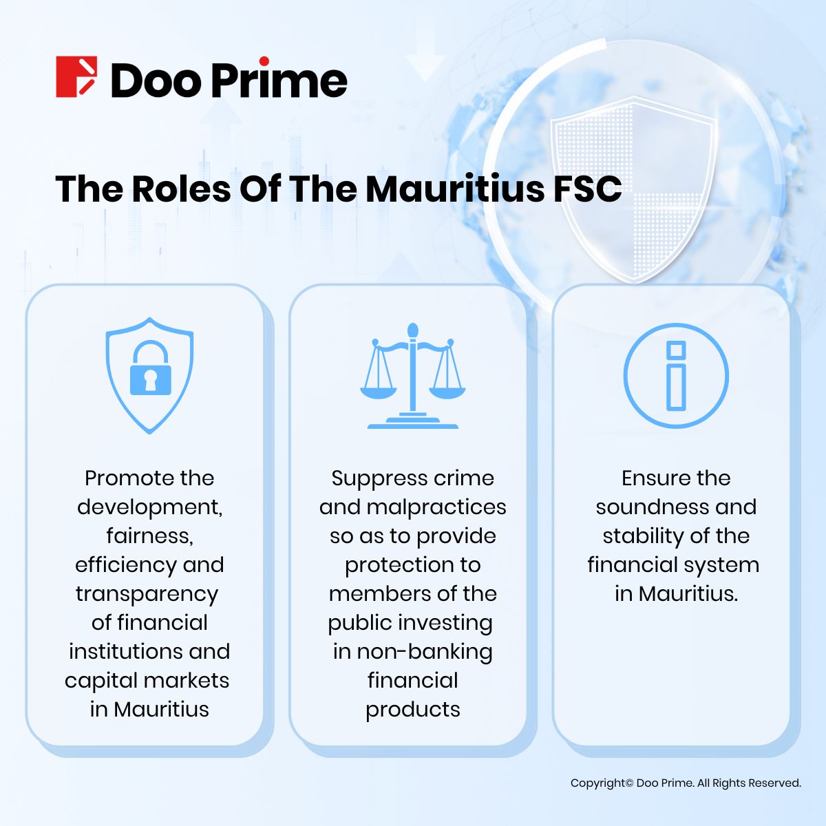 Under the supervision of the Mauritius FSC, Doo Prime strictly abides by the relevant rules and regulations, ensuring every trading transaction is transparent and safe.