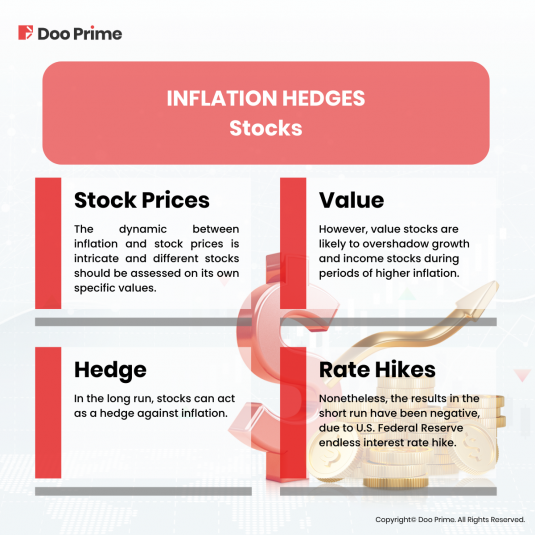In the long run, stocks can act as a hedge against inflation. With rising inflation, the value of stocks will appreciate over time, as businesses will eventually adapt to the inflationary pressures and adjust their own prices. Hence, revenues will increase, and normal profit rates may resume, leading to investors getting their dividends returns.