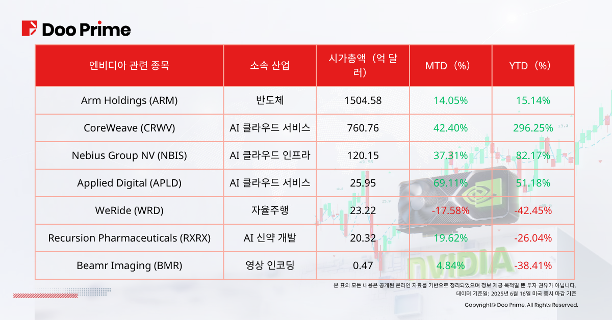 엔비디아의 투자 포트폴리오 내 기업들도 주목할 만한 흐름을 보이고 있는데 특히 데이터 센터 건설업체 CoreWeave(CRWV)는 지난 3월 말 상장 이후 2025년 6월 16일 종가 기준 누적 상승률이 290%를 돌파했습니다.
