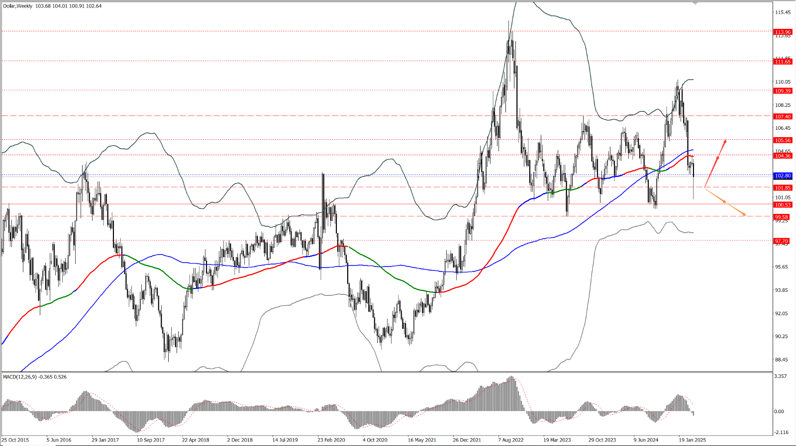- 本周关注周多空分届 101.85 一线;如果美指运行于 101.85 一线上方,则关注美指随后的反弹力度和幅度,届时依次关注 104.36 和 105.56 两个位置的压制力度;