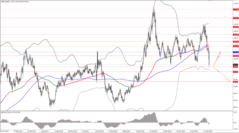 • 如果美指力度跌破 99 一线,则依次关注 97.70 和 95.10 两个位置的支撑力度,尤其关注 97.70 一线的支撑力度。