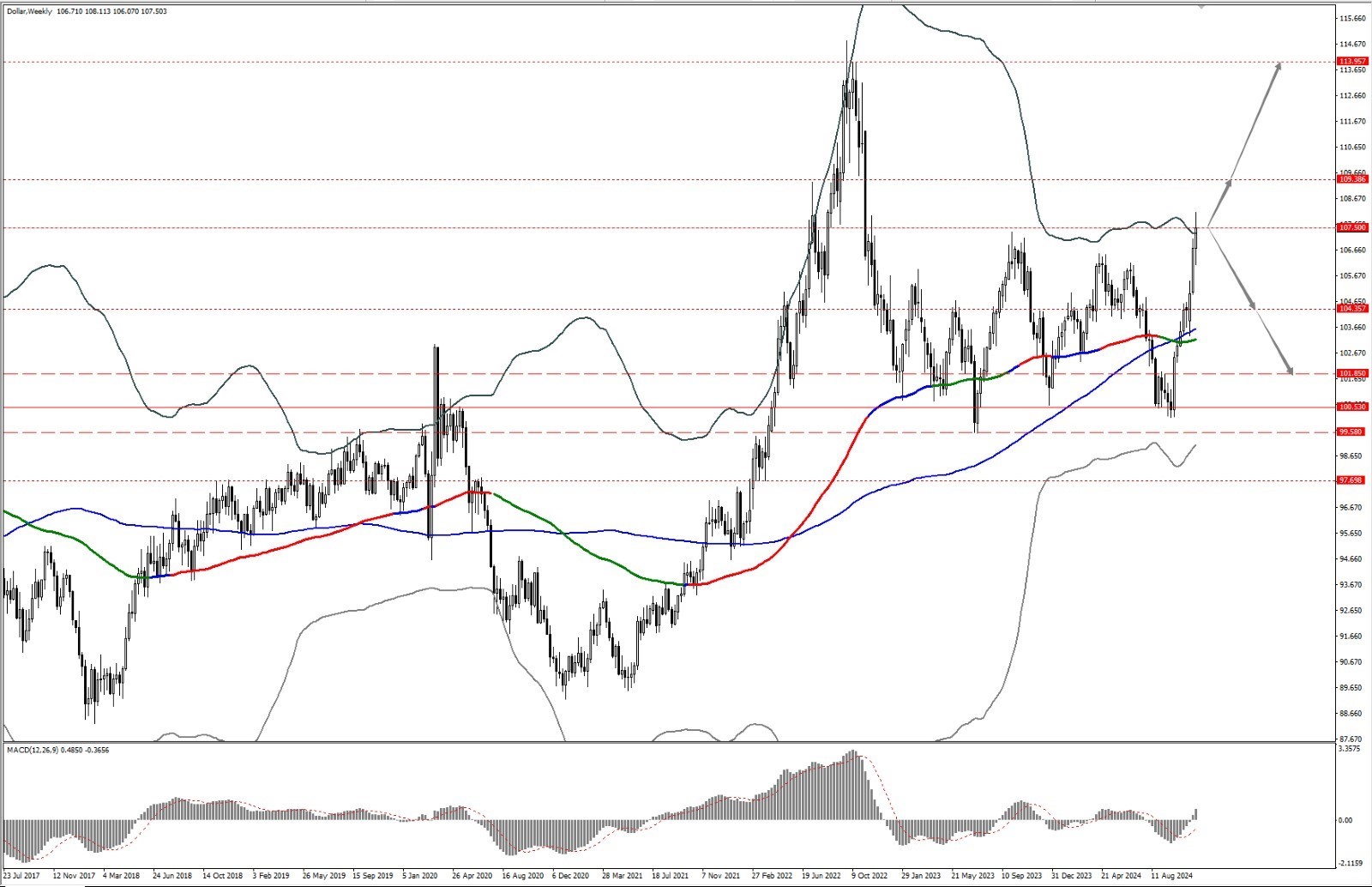 • 上周美指持续拉升,最终当周收盘于关键位置 107.50 一线附近;