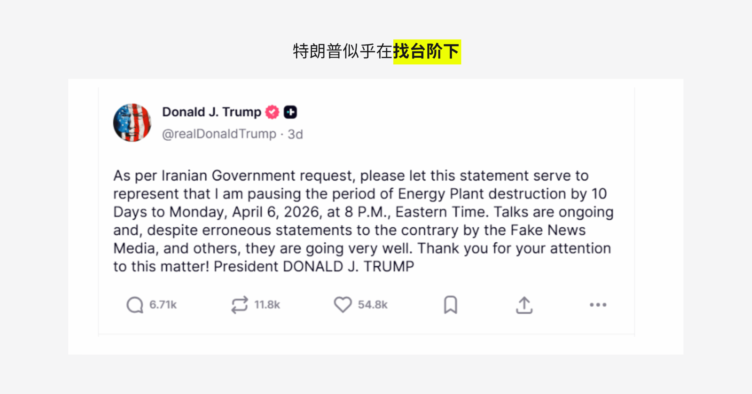 美军虽装备先进,但通胀攀升、股市下跌及选民的不满,已令特朗普面临巨大压力。其近期推文宣布“将打击行动推迟至 4 月 6 日”,明显意在为自己寻找缓和局面的台阶。