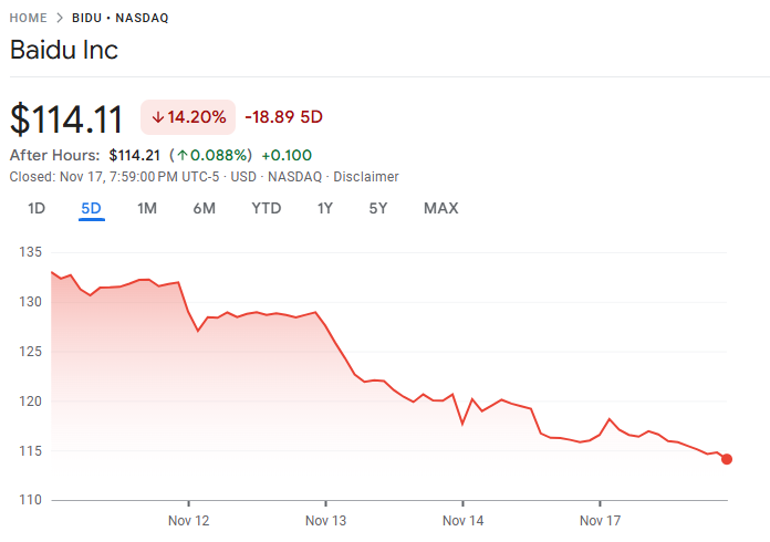 11 月 17 日至 18 日,百度(BIDU)周五举行了旗下旗舰模型 Ernie 5.0 的发布会,但升级内容被认为缺乏亮点,引发投资者失望,股价随即大幅下挫。