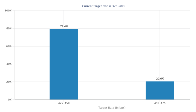 美国公布的 11 月 CPI 数据进一步回落且同环比均低于市场预期,这延续了 10 月超预期下行的趋势,也强化了 12 月放缓加息的预期。如今美联储在 12 月 15 日加息 50 基点概率已是板上钉钉,因为刚公布的 CPI 不太可能动摇目前的决定。芝商所的 FedWatch 工具显示,美联储周四加息 50 个基点的概率高达 80%,加息 75 个基点的概率仅为 20%。