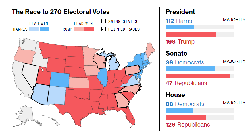 截至发稿,美国的投票站陆续关闭,共和党总统候选人特朗普赢得了亚拉巴马州、密西西比州、南卡罗来纳州、俄克拉何马州、佛罗里达州、田纳西州,共计获得了 198 张票。民主党候选人哈里斯赢得了马萨诸塞州、康涅狄格州、马里兰州、罗德岛州和华盛顿特区,共计 112 张票。