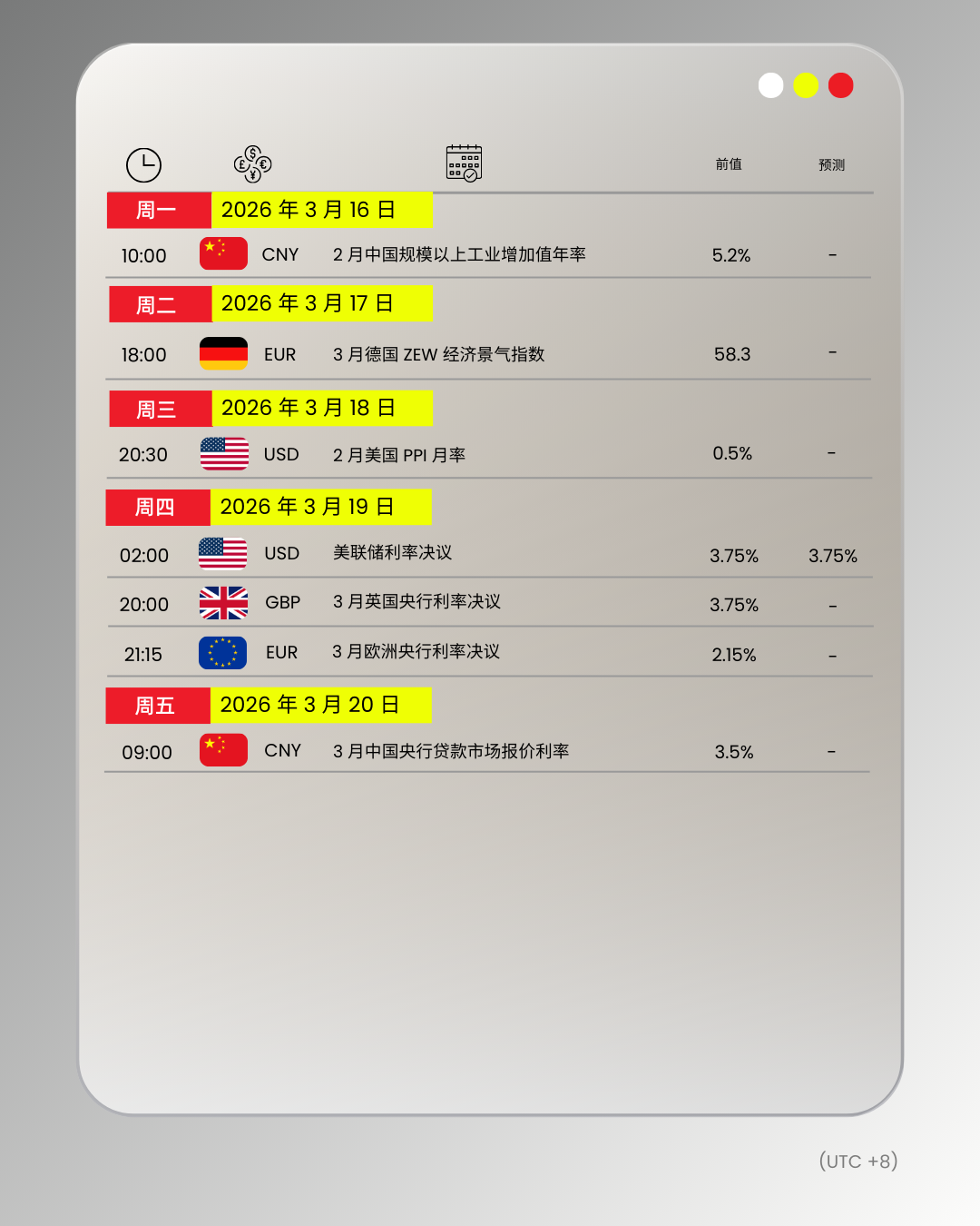 财经日历 | 以下为 2026 年 3 月 16 日至 2026 年 3 月 20 日(GMT+8 北京时间) 全球重大经济事件提醒。在重大行情期间,请确保您已审查您的保证金率,并有足够的保证金来支撑您的风险敞口。