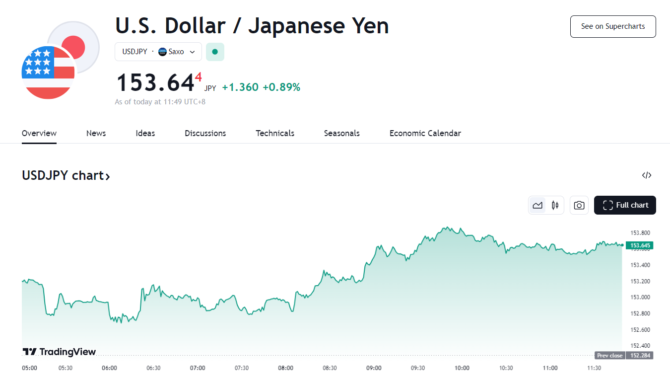 日元则跌至三个月低点,美元兑日元最高触及 153.67,为 7 月 30 日以来最高水平。截至发稿,美元兑日元上涨近 0.9%,报 153.62。此前日元已连续四周下跌。