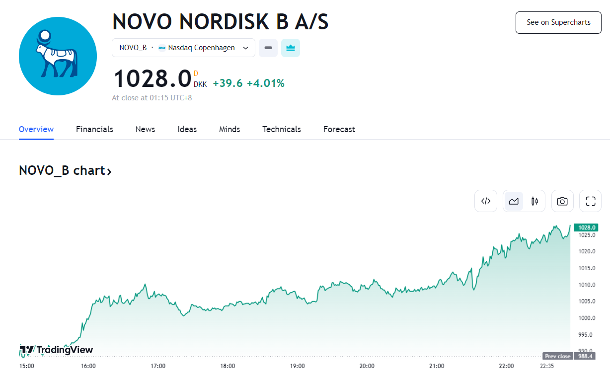 25 日,诺和诺德欧股收涨约 4%,收报 1028 丹麦克朗,创历史新高,史上首次突破 1000 丹麦克朗(约合 144 美元)。