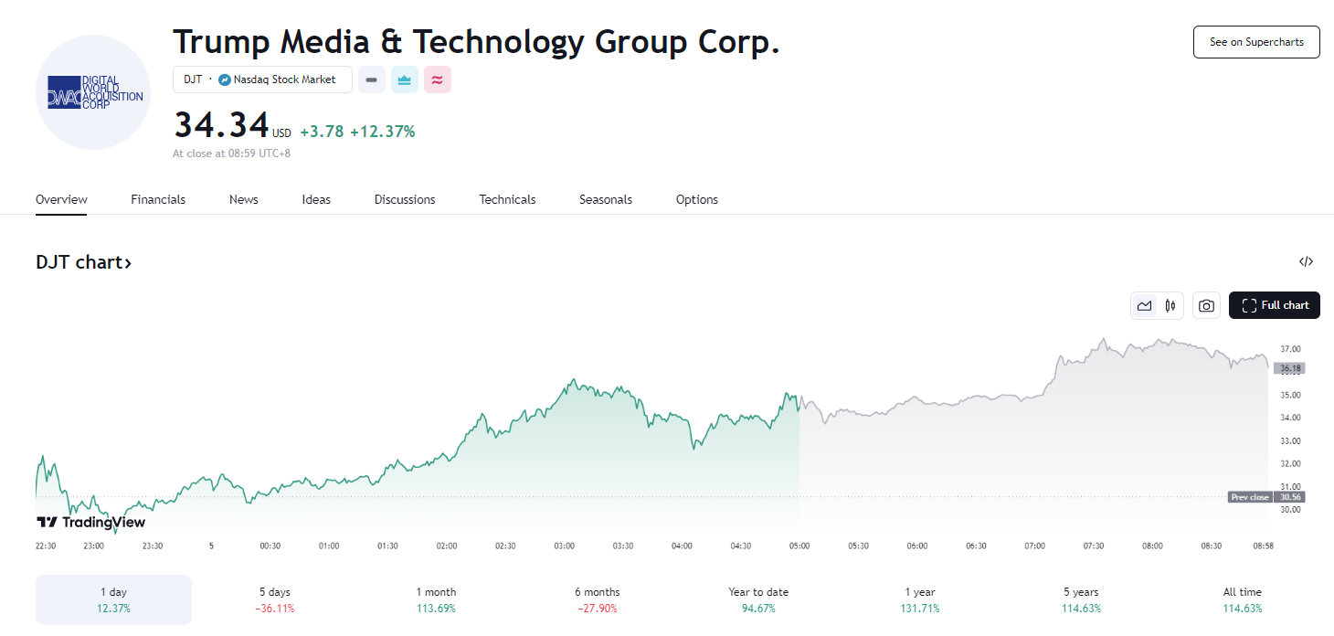 11 月 4 日,在美国大选进行前夕,特朗普概念股——特朗普媒体科技(DJT)股价收盘大涨 12.4%,盘后又涨 8%,似乎意味着市场重新押注特朗普将竞选成功。