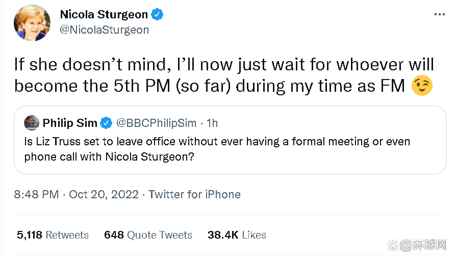 特拉斯在任相期间的 45 天里未能按照以往惯例给苏格兰、威尔士和北爱尔兰这三个联合王国的重要组成部分的领导人进行礼节性的通话。苏格兰首席大臣尼古拉·斯特金( Nicola Sturgeon )此前曾对此事表达了不满。在特拉斯宣布辞职后,斯特金则调侃说: “没关系,我可以等我任期内上台的第五个英国首相来电。”