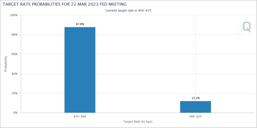 经济学家、Naroff 经济研究所的主席 Joel Naroff 表示,消费者正处于相当不错的状态,当人们对于自己的就业状态感到舒适的时候,这种情绪就能转化为消费。最新 “芝商所美联储观察工具 ( CME FedWatch Tool )” 显示,美联储 3 月加息 25 个基点的概率为 87.8%,加息 50 个基点的概率仅为 12.2%。