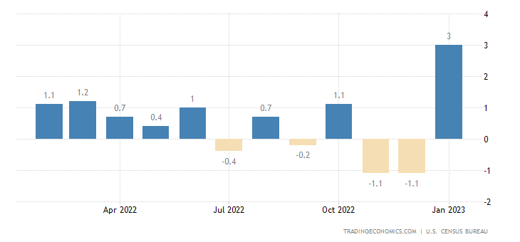 北京时间 2 月 15 日,美国商务部普查局发布 “恐怖数据” ,美国 1 月零售销售数据环比增加 3%,远超市场预期的 1.8%,前值为 -1.1%,为 2021 年 3 月以来最大增幅。