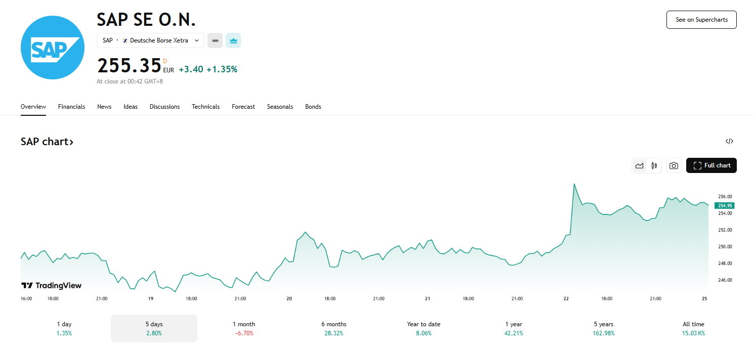 作为欧洲最大的软件制造商,SAP 提供企业应用软件,用于公司财务、销售、供应链和其他核心业务功能。近年来,其股价大幅攀升,部分原因是市场看好其云业务将从生成式人工智能投资浪潮中获益。