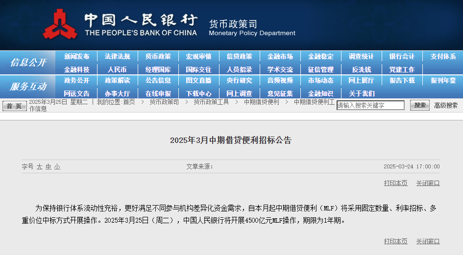 24 日,中国央行宣布,3 月 25 日将开展 4500 亿 MLF 操作,并从本月起,将 MLF 操作由单一价位中标调整为多重价位中标。