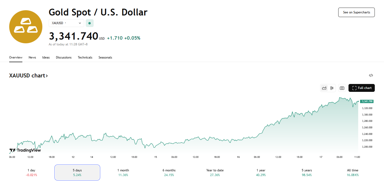 17 日,截至发稿,现货黄金再度突破 3340.00 美元/盎司关口,最新报 3341.74 美元/盎司。COMEX 黄金期货主力最新报 3355.2 美元/盎司,日内涨 0.26%。
