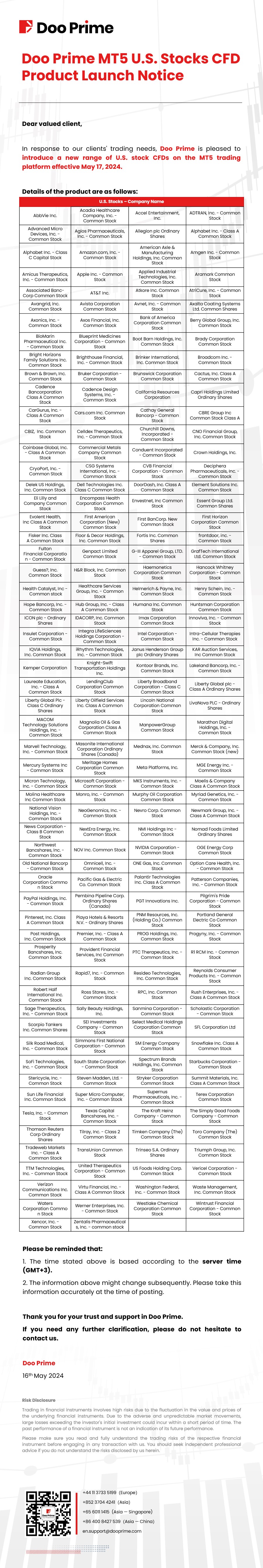 Doo Prime MT5 U.S. Stocks CFD Product Launch Notice