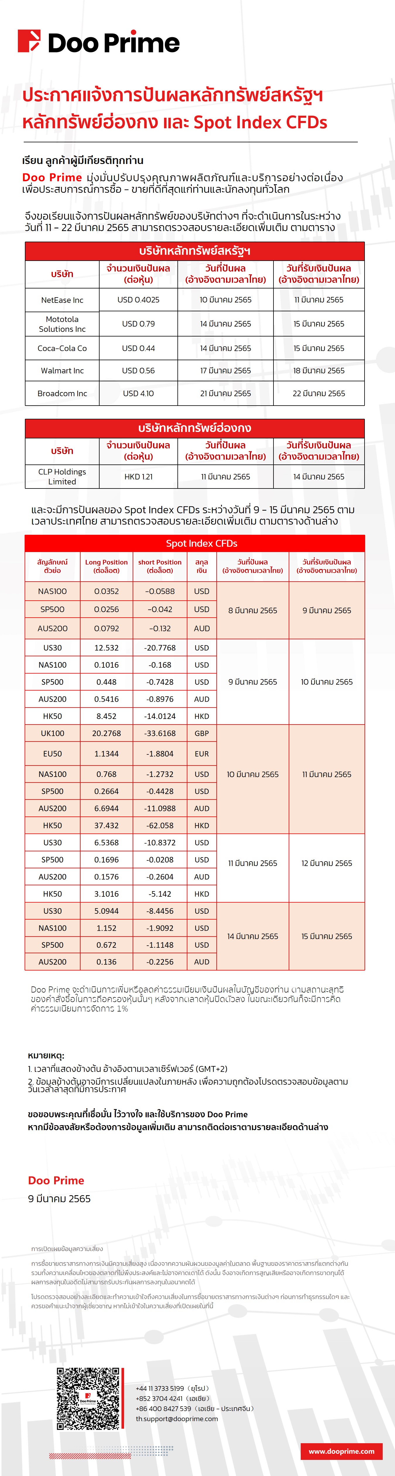 2022-03-09 | H.K. Securities , Spot Index , U.S. Securities , ปันผลหลักทรัพย์