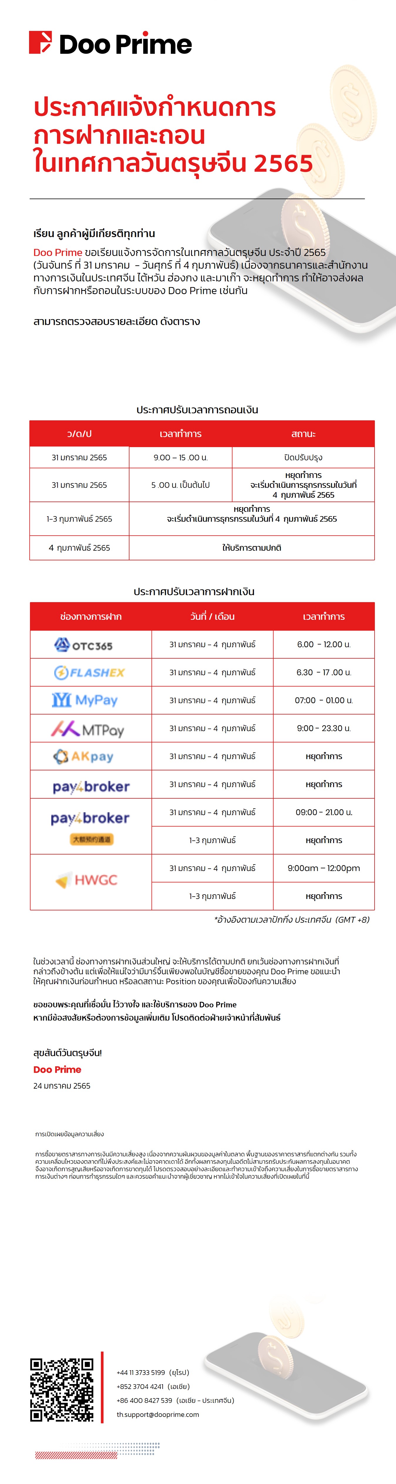 Doo Prime ประกาศแจ้งการให้บริการฝากถอนในเทศกาลวันตรุษจีน ประจำปี 2565