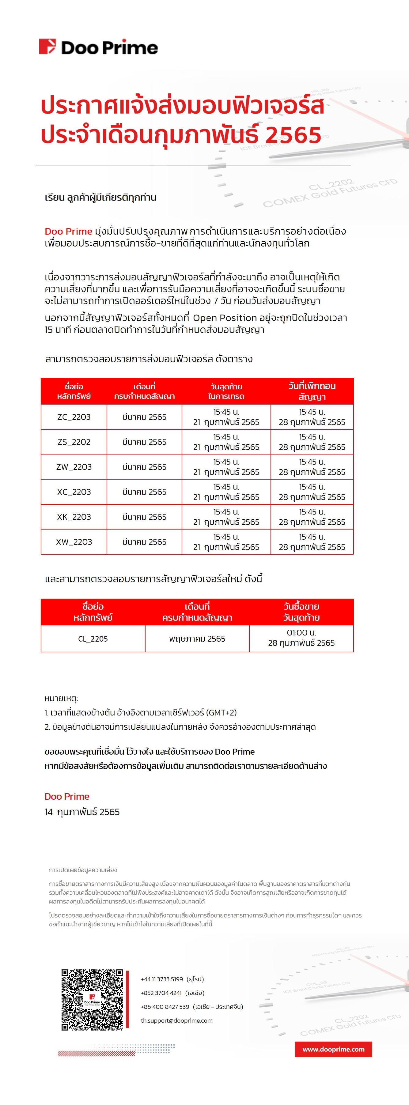 Doo Prime แจ้งกำหนดส่งมอบฟิวเจอร์สและฟิวเจอร์สใหม่ กุมภาพันธ์ 2565