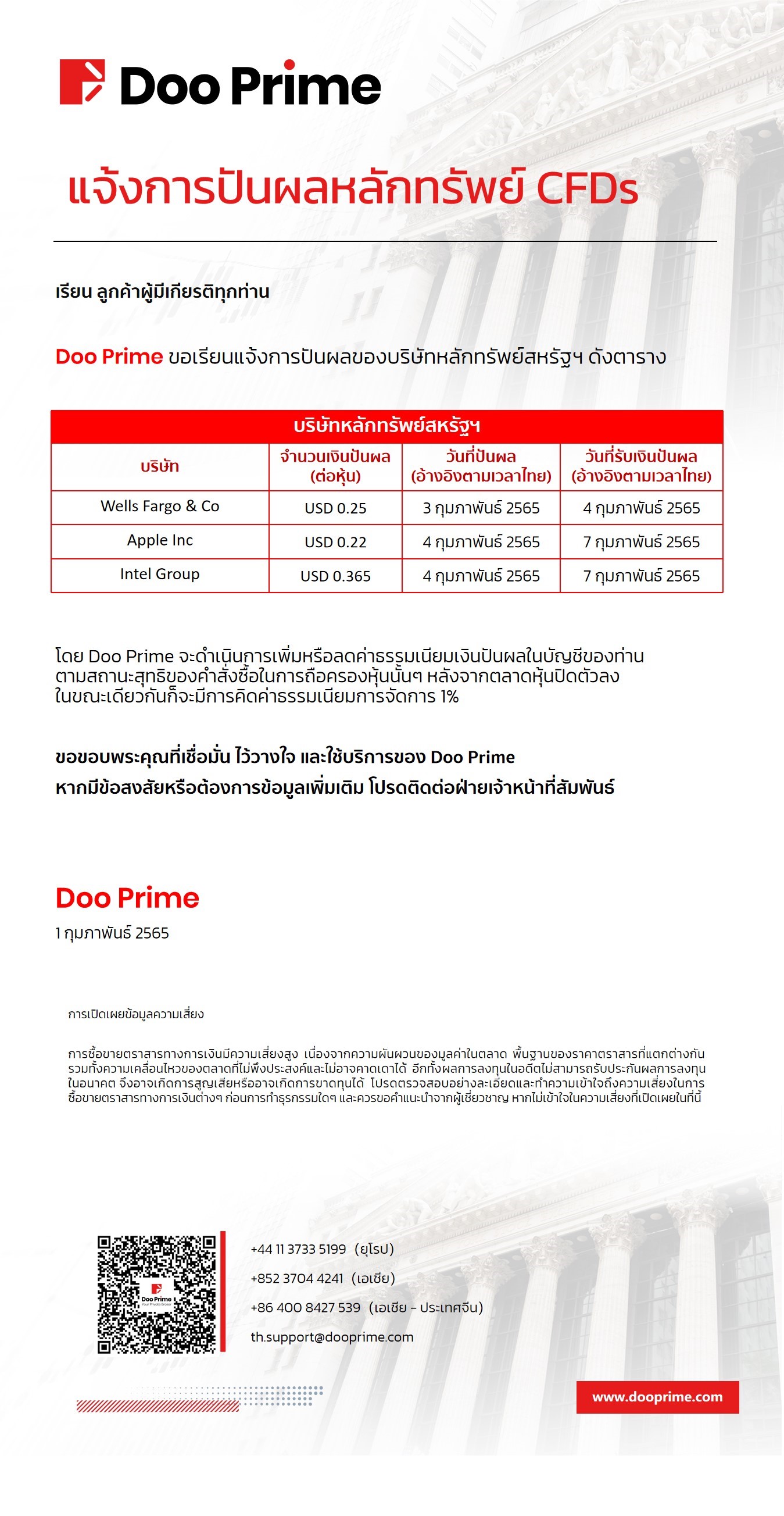 Doo Prime แจ้งปันผลหลักทรัพย์ CFDs
