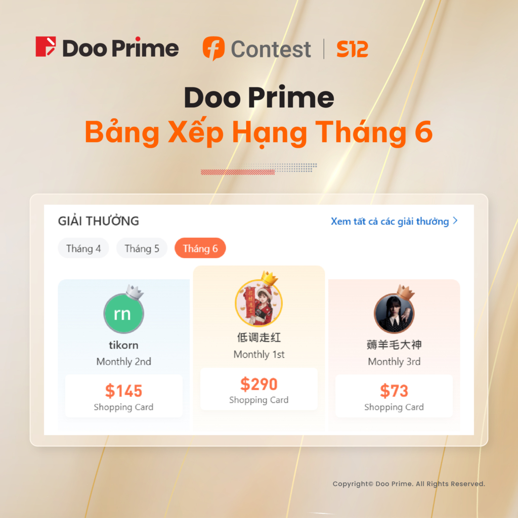 Kéo dài trong vòng 3 tháng, cuộc thi mới nhất với sự góp mặt của Doo Prime trong tư cách nhà tài trợ kim cương – Đấu Trường Giao Dịch FOLLOWME S12, đã quyết định trao thêm những phần thưởng hấp dẫn với 3 người chơi có thành tích tốt nhất trong bảng xếp hạng hàng tháng. Theo đó, các nhà giao dịch ưu tú này đã chính thức sở hữu cơ hội chia sẻ khoản thưởng tiền mặt hơn 500 USD/tháng.