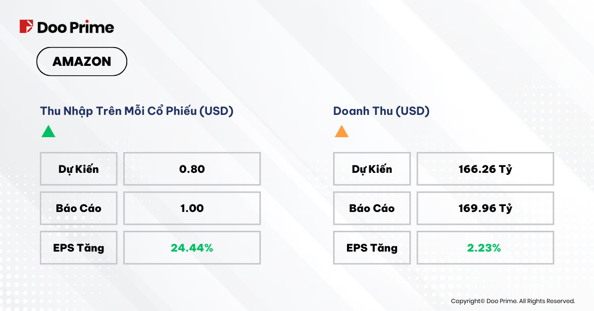 Không giống như hai ông lớn ở trên, doanh thu Q4 của Amazon thu hút rất nhiều sự chú ý của nhà đầu tư. Ông lớn thương mại điện tử đã vượt qua mọi mức kỳ vọng về tăng trưởng doanh thu và EPS. Amazon Web Services (AWS), nhánh điện toán đám mây của Amazon, tiếp tục thúc đẩy tăng trưởng và doanh thu quảng cáo vượt ngoài mong đợi. Nhờ vậy, doanh thu tăng trưởng dương đã thúc đẩy cổ phiếu của họ tăng cao.