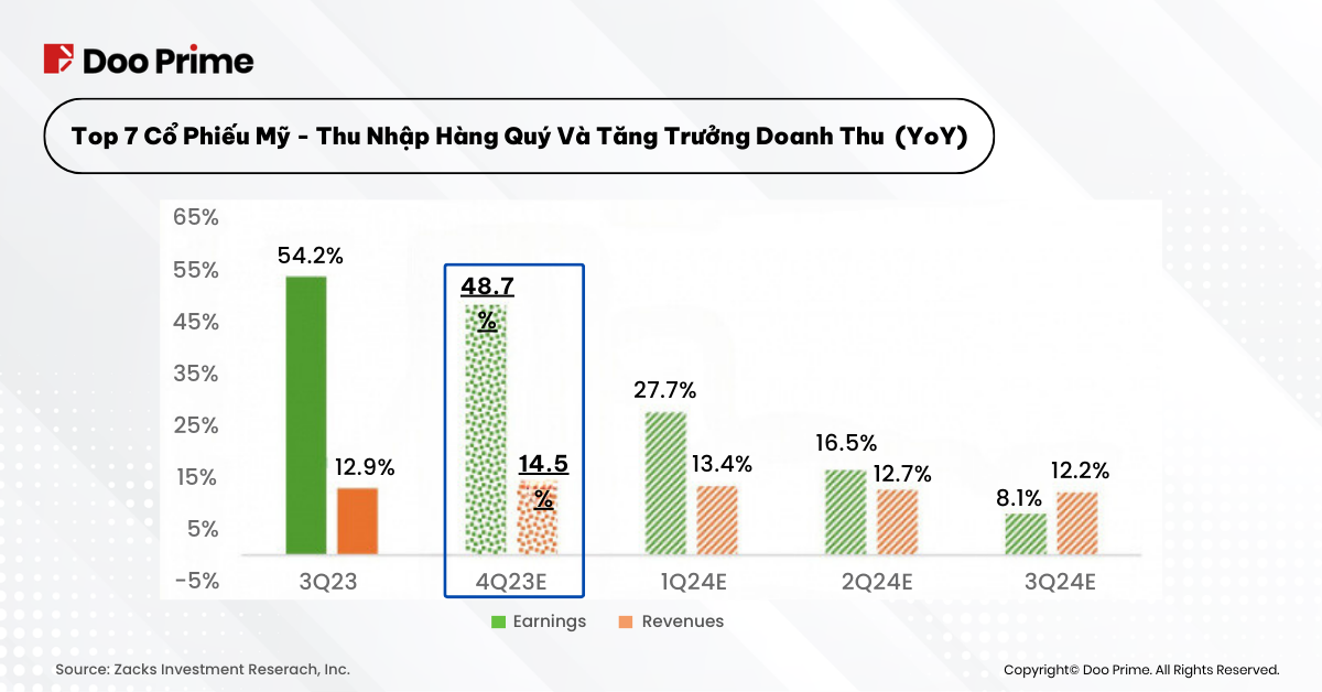 Xem xét dự báo cho Nvidia, dự kiến công bố kết quả quý thứ tư vào ngày 21 tháng 2, và kết quả thực tế cho các thành viên còn lại của nhóm, lợi nhuận tổng cộng cho Quý 4 của Magnificent 7 được dự kiến tăng lên +48,7% so với cùng kỳ năm trước, với doanh thu tăng lên +14,5%.