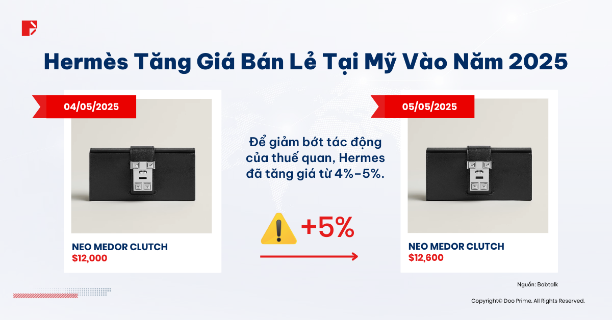 • Hermès, vốn nổi tiếng với vị thế siêu độc quyền, đã tiến hành tăng giá bán lẻ tại Mỹ thêm 4-5% từ ngày 1 tháng 5, bên cạnh mức điều chỉnh hàng năm thông thường là 6-7% nhằm giảm bớt các tác động đến từ mức thuế quan mới.